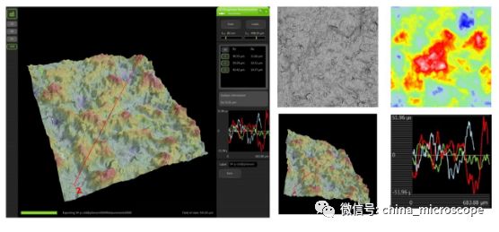 图7显示的是根据大面积自动扫描后的拼图结果,自动进行大面积孔洞统计分析,用到的两个软件分别是自动拼图AIM(Automated Image Mapping)和孔洞统计系统(PoroMetric)。这个过程几乎不需要人工干预,电镜自动进行采集图片和大批量(1000张图片)分析,自动化程度较高,统计结果是基于真实的图片信息,结果更为可靠。图8显示的是样品实时观察位置的3D形貌,利用的软件是三维粗糙度重建3DRR(3D Roughness Reconstruction),提供样品表面粗糙度信息。