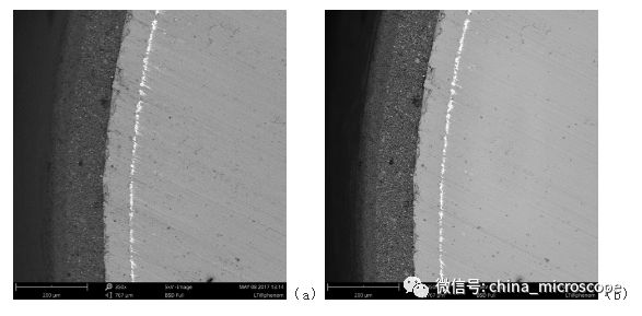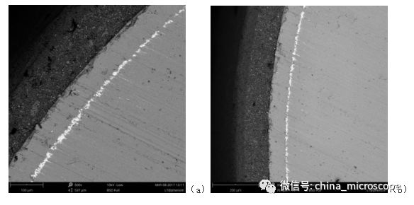 图5显示了陶瓷样品同一个位置的不同模式下的形貌图,可以看出,背散射(图a)图片对镀层之间的金属层可以清晰区分,呈现亮白色,而二次电子模式则无法清晰区分,而且图b中的二次电子模式有一定程度的荷电效应,对于样品的导电性要求更高。低真空的背散射模式基本上能够满足大部分的测试需求。