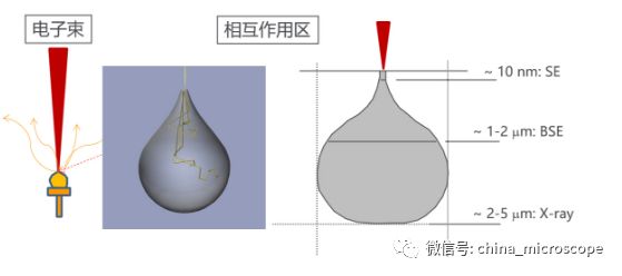 但是实际上,不仅要考虑绝对分辨率这个单一参数,而且要综合考虑电子束与样品的相互作用,以能够反映观测者所需要的信息,为最终衡量标准来判断。图3中反映的是电子束和样品的相互作用区三维图和示意图,加速电压越高,1~2μm的BSE信号产生区将会向下扩展,也就意味着图2(a)中包含了更多表面细节信息的信号,而图2(b)中则包含了更多深层次信息,更表层的原子信息比例减少。这就解释了图2(b)中分辨率更高,反而细节信息更少的原因。这也是为什么在采购电子显微镜时,往往不能只看最高分辨率参数(虽然的确非常重要)的重要原因,一定要拿样品实测。