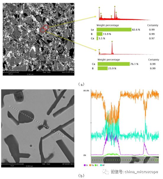 除了基本的形貌观察之外,电镜的一些选配件可以实现诸如能谱分析、EBSD、阴极荧光等其他角度的分析。其中最常见的当属电镜能谱分析(EDS),在图6中可以看到,电镜能谱分析的一般方式,即调整电压和束流参数至合适,直接选点、划线、框面进行分析,数分钟之后结果便一目了然。在陶瓷样品中,经常需要研究掺杂相的分布,比如均匀混合还是只分布于晶界,此时通过图片显然不能确定,加上微区成分信息的数据,就有一锤定音的效果了。