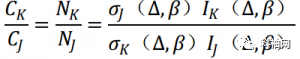 但是,在实验上很难测量电离损失峰的总强度IK 和IJ ,通常只能在某一能量窗口内和某一散射角范围( 0~β)内统计电离损失峰的总强度IK (∆,β)和IJ(∆, β) 及计算相应的散射截面σK(∆, β)和σJ(∆, β)。于是两种元素的成分比可写成: