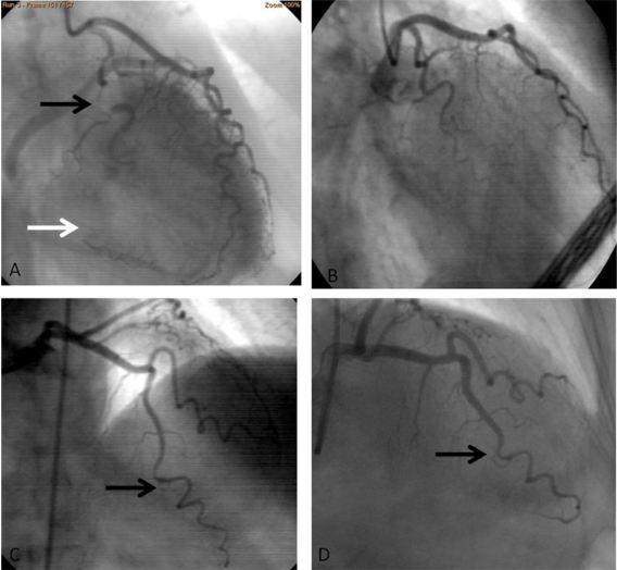 1 周后,患者再次因相同症状入院,心电图检查提示 V3-V6 导联 ST 段压低,T 波低平,再次行冠脉造影显示回旋支和右冠正常,左前降支远端明显痉挛(图 1C),冠脉内注射硝酸酯类药物后缓解(图 1D)。2 天后患者出院并加大钙离子拮抗剂剂量。