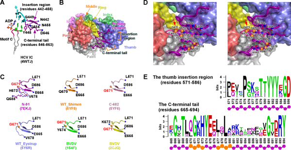 图1.CSFV RdRP晶体结构展示了较为完整的引发元件。A、HCV RdRP引发复合物的晶体结构;B、CSFV RdRP的整体结构,其中引发元件为紫红色;C、瘟病毒属 RdRP引发元件结构对比;D、CSFV RdRP引发元件及其周围区域的立体对像图;E、瘟病毒属RdRP引发元件氨基酸序列保守性分析。