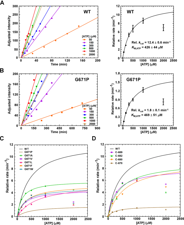 图2.CSFV RdRP及其突变体的酶学表征。A-B:WT(A)和G671P突变体(B)的单步引发反应动力学分析。C-D:G671位点其他突变体(C)和C端截短体(D)的引发反应动力学分析。其中,WT和G671P的米氏方程拟合曲线分别取自A和B。