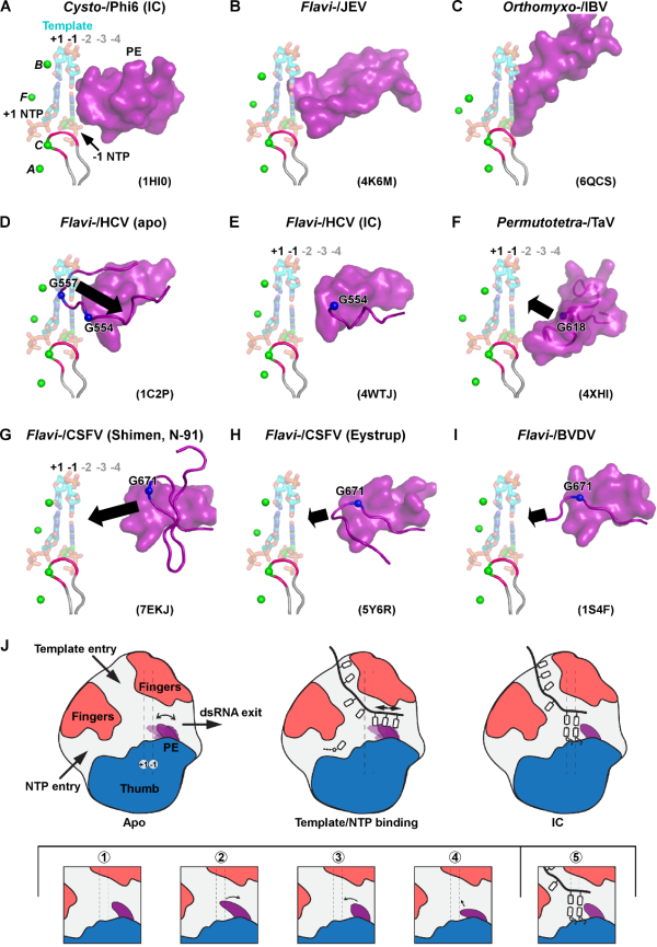 图3.RdRP引发元件的结构比较提示RdRP从头合成可能具有普适性的诱导契合机制。A-I、代表性病毒 RdRP引发元件的比较。J、从头合成型RdRP引发时的诱导契合模型。当RdRP处于非底物结合状态时,引发元件可具有多种构象(左上图和下图1-4),而RdRP结合模板RNA和NTP后,引发元件可经历构象变化后到达RNA模板的末端,同时稳定参与引发反应的NTP,实现精准高效引发。下图中的箭头表示引发元件达到其引发状态所需构象变化的方向。