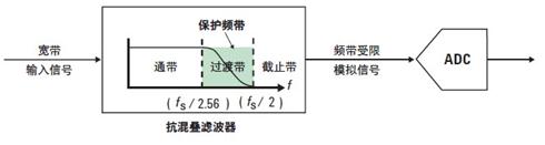 有两个因素会导致简单的抗混叠方法复杂化。第一个也是最容易解决的因素是,抗混叠滤波器的滚降 (roll off) 速率是有限的。如图 6 所示,在实际滤波器的通带和截止带之间有一个过渡带。这个过渡带中的频率可能产生混叠。为了避免这些混叠分量,滤波器的截止频率必须低于理论频率上限 ƒs/2 。