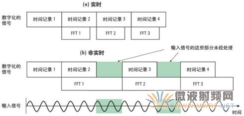 图 10. (a) 当 FFT 处理时间 ≤ 时间记录长度时,处理是“实时”的;没有数据丢失。(b) 如果
