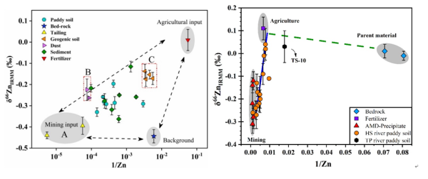 为深入了解具有不同环境条件及地质背景下矿区周边农田土壤重金属的来源及迁移途径,中国科学院地球化学研究所研究员刘承帅课题组以地表性质差异显著的西南喀斯特和华南红壤典型矿区为目标区域,研究不同环境介质的Zn稳定同位素组成,并结合源识别模型,构建基于金属稳定同位素分馏的农田重金属源解析定量化方法,定量解析喀斯特和红壤矿区农田土壤中Zn污染来源,明确两个矿区Zn迁移途径,为土壤重金属污染源头控制及迁移过程解析提供理论依据。