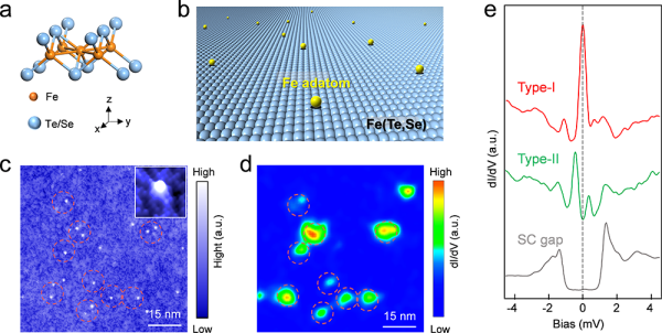 图1 FeTe0.55Se0.45单晶表面沉积单原子铁示意图和铁原子上两种束缚态