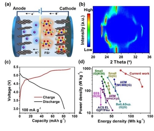 (a)钾基双石墨电池的结构以及工作机理示意图;(b)阴离子(FSI-)插层石墨正极的原位XRD表征;(c)钾基双石墨电池的充放电曲线;(d)与已有报道的能量及功率密度比较