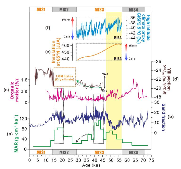 近日,中国科学院地球环境研究所一带一路气候环境中心中亚黄土研究组研究员宋友桂等通过对我国新疆伊犁地区黄土记录的末次冰期以来的沉积速率变化研究,揭示了该地区MIS3阶段(56-28ka)粉尘通量的变化机理。基于石英光释光年代与贝叶斯年龄模型,研究组建立了末次冰期以来的粉尘堆积通量。通过与湿度、风力指标进行细致的对比,发现粉尘堆积通量的变化不仅受到风力状况的影响,而且更重要的是受到黄土源区提供沉积物的能力、沉积区的地表粗糙度(或植被覆盖度)的驱动。研究组发现相对温暖的MIS3阶段比寒冷的MIS2阶段(29-13ka)出现了更高的沉积速率(图1),这主要归因于源区沉积物供给能力。结合东亚黄土高原的黄土沉积通量,通过与西风下风向远距离沉降区(北太平洋与格陵兰地区)粉尘浓度对比(图2),证明亚洲粉尘向下游的远距离输出通量与西伯利亚高压、大气环流的搬运效率密切相关。进而提出北半球冰量与高纬度夏季太阳辐射可通过影响西伯利亚高压的强度分别在冷期和暖期控制着剖面地区的风力状况的观点。