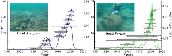 水下成片死亡的鹿角珊瑚和滨珊瑚;每个U-Th年代峰值对应该年大量珊瑚的死亡