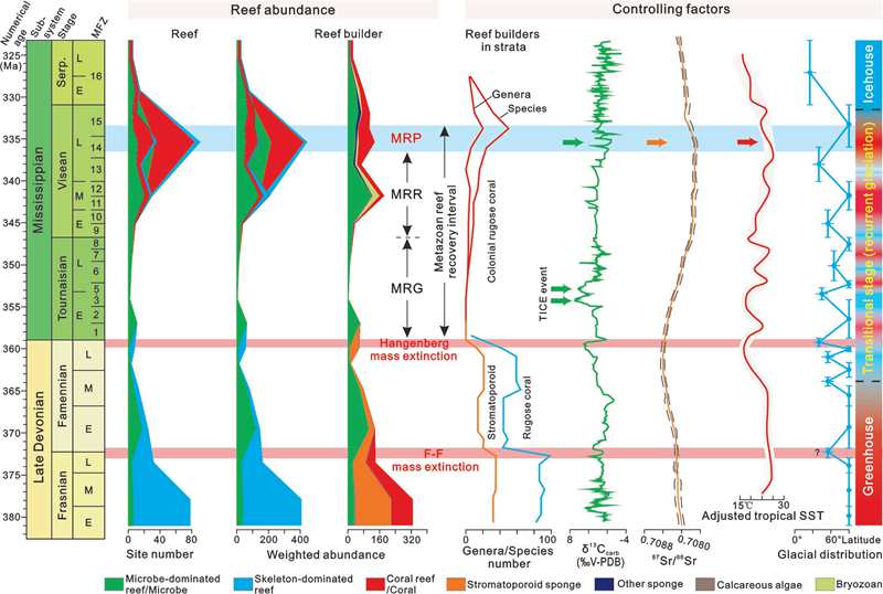 与显生宙中-晚寒武世和早-中三叠世两次显著的后生动物礁延迟复苏相比,密西西比亚纪的后生动物礁复苏更加延迟,即继晚泥盆世层孔虫-珊瑚礁生态系统崩溃和消失之后,经历了约23个百万年才出现全球珊瑚礁生态系统繁盛,其可能与该时期海洋缺氧和频繁的冰期-间冰期变化有关。维宪晚期珊瑚礁繁盛可能由该时期气候相对变暖导致。