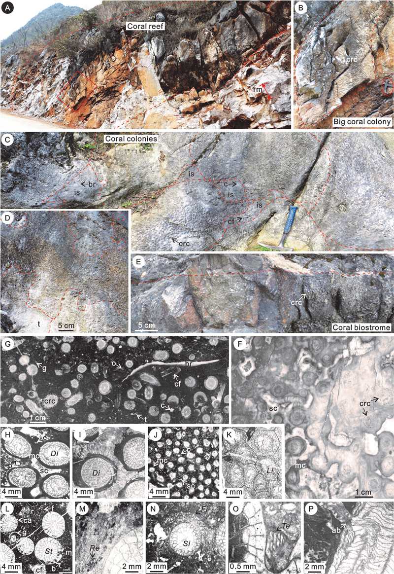 华南密西西比亚纪维宪晚期珊瑚礁野外(A-E)、光面(F-G)和薄片(H-P)图片