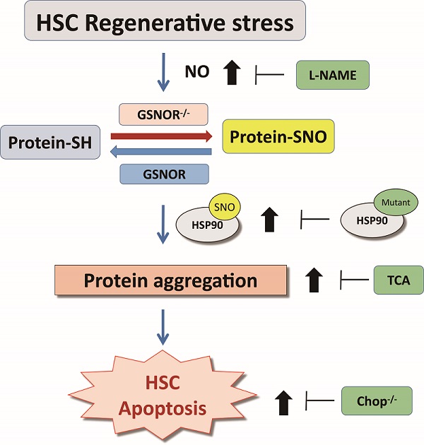 研究发现,增殖压力下造血干细胞中NO及整体蛋白巯基亚硝基化修饰SNO的水平明显升高,同时伴随着大量蛋白聚集的累积,该结果提示NO及SNO对增殖压力下造血干细胞具有一定的调控作用。研究利用调控蛋白质巯基去亚硝基化关键酶GSNOR敲除的小鼠进一步发现,敲除GSNOR对于稳态情况下的造血系统表型没有显著影响。然而,在增殖压力下,敲除GSNOR的小鼠HSC造血重建能力下降,自我更新能力减弱。研究通过亚硝基化修饰蛋白组学联用质谱、流式细胞术等方法,发现敲除GSNOR的HSC中NO及整体SNO水平明显升高,同时细胞聚集体的累积及细胞凋亡显著增加。为了证明过度激活的NO信号通路诱导GSNOR敲除小鼠HSC重构缺陷的假设,研究用NO的抑制剂L-NAME处理,发现GSNOR敲除小鼠的造血重建能力及自我更新能力均明显增强。同时,给予帮助蛋白折叠的分子伴侣TCA处理及在GSNOR敲除小鼠中同时敲除诱导凋亡的Chop基因,均能明显改善GSNOR敲除小鼠的造血重建能力。