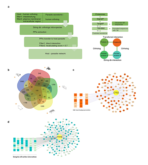 图1.五种非模式哺乳动物与其寄生蛔虫基因组水平的蛋白互作分析发现,免疫调节蛋白CTSZ和P4HB在蛋白互作网络中发挥中心作用