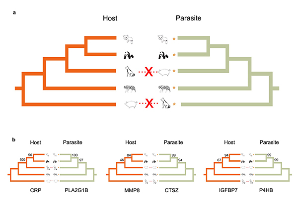 图2.哺乳动物宿主和其寄生蛔虫物种水平(a)和基因水平(b)的系统发育关系,反映基因水平的宿主和蛔虫之间的协同演化