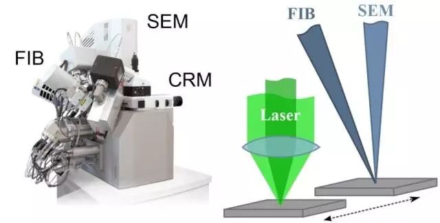图1:将共聚焦显微拉曼光谱仪安装到聚焦离子束扫描电镜上,两种分析之间的切换只需通过单击鼠标即可完成
