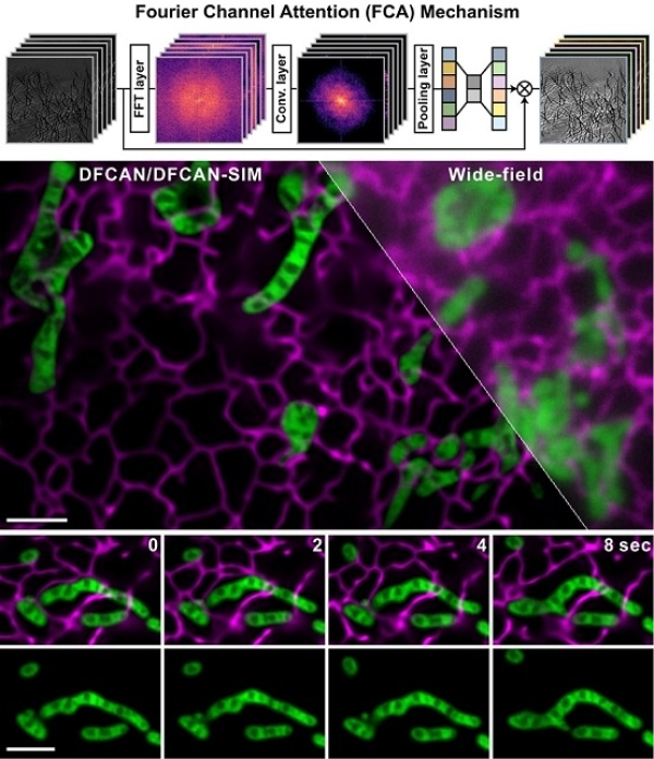 上图为傅立叶域注意力机制深度学习算法框架图。下图是基于DFCAN和DFGAN结构光超分辨重建活细胞内的线粒体内膜结构(绿色)和内质网(紫红色),扑捉到线粒体在内质网与线粒体接触位点线粒体融合的动态过程。