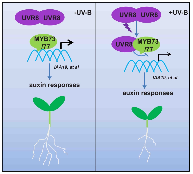 刘宏涛研究组的研究发现,UV-B抑制侧根生长,并且该抑制依赖于UVR8,UV-B抑制侧根生长的表型在uvr8突变体中明显减弱。进一步的研究发现UV-B通过UVR8抑制生长素信号通路,而且只要根中有UVR8表达,其根的表型就与野生型一致,说明根中UVR8自主调控侧根的生长。酵母双杂交筛选UVR8结合蛋白获得MYB转录因子家族的MYB73 (MYB DOMAIN PROTEIN 73),它在酵母中能与UVR8以UV-B依赖的方式相互作用。进一步的研究发现MYB73的同源基因MYB77 (MYB DOMAIN PROTEIN 77)也能与UVR8以UV-B依赖的方式相互作用。表型分析发现MYB73/MYB77参与调控UV-B下侧根的生长,并且位于UVR8的下游。机制研究表明UVR8与MYB73/MYB77的DNA结合域相互作用抑制MYB73/MYB77的DNA结合能力,进而抑制其对生长素相关基因的激活作用,调控UV-B下拟南芥侧根的生长发育。这些结果说明UV-B激活UVR8不仅调控地上部分发育也同时调控地下部分发育,UV-B促进的UVR8-MYB73/MYB77结合是光受体UVR8信号转导的早期机制,也是外源光信号和内源生长素信号协同调控植物发育的整合点。