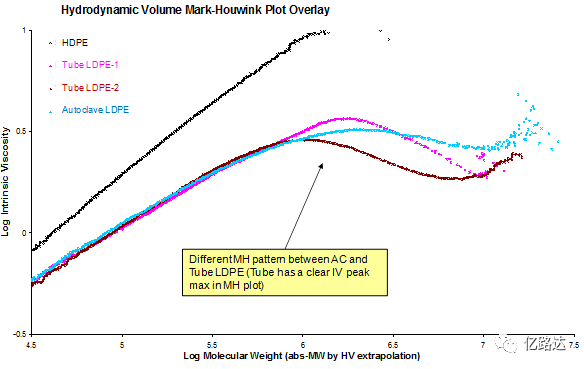 据报道某研发人员用红外检测器和粘度检测器联用,在分析管式LDPE和釜式LDPE时通过马克洪温曲线看出了两者的不同(见图4),管式LDPE的马克洪温曲线有明显的拐点,而釜式LDPE则没有。如果没有灵敏的红外检测器,这种细微的区别是无法发现的。