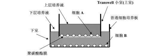 ③嵌入式细胞共培养法(Transwell 小室):Transwell小室是一类有通透性的杯状装置, 杯子底层放一张有通透性的膜,一般常用的是聚碳酸酯膜,孔径大小有0 .1~12 .0 μm。将Transwell小室放入培养板中, 细胞A种在上室内,下层种植的细胞B其培养液中的成分可以影响到上室内的细胞,从而可以研究细胞B分泌或代谢产生的物质对细胞A生长、运动等的影响。
