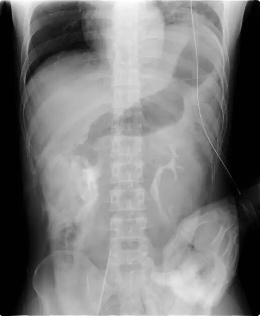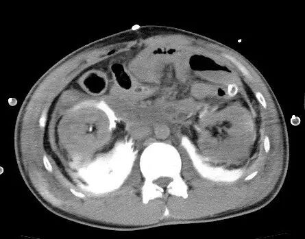 患者,男,29岁,因高速事故外伤入院,事故发生时患者系有安全带,从车内弹出。患者主诉呼吸困难,左肺呼吸音减弱。进行静脉管和左胸导流管置入,后紧急送往医院接受治疗。患者腹部可见安全带勒痕。全身增强CT扫描示左侧膈肌破裂、脾损伤,左肾I级损伤伴有腹膜后血肿。行紧急剖腹手术,见大面积血肿。对左膈肌和脾损伤部位进行缝合处理,修复肠系膜。由于腹膜后血肿面积不断扩大,因而对肾损伤采取保守治疗。手术期间共输注10个单位的红细胞,患者血清蛋白水平升高至10.5g/dL。