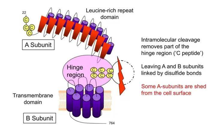TSHR是一种细胞表面糖蛋白受体,属于G蛋白偶联受体(GPCR)家族成员,由764个氨基酸组成,分子量为87kDa。人类TSHR编码基因位于14号染色体长臂(14q31),基因共含10个外显子,前九个外显子编码胞外庞大的N-端区,该胞外区包含一个富含亮氨酸的重复结构域,通过铰链区与跨膜结构域相连;第十个外显子则编码七个跨膜片段以及胞内短小的C-末端。不同于其他糖蛋白激素受体,TSHR胞外结构域中插入了一个包含50个氨基酸的序列(C肽),在翻译后修饰过程中,金属蛋白酶介导的分子内裂解作用使TSHR的N-端胞外结构域与跨膜螺旋结构域分离,C肽序列被移除,使TSHR转化为通过二硫键连接的A亚基(289aa)和B亚基。