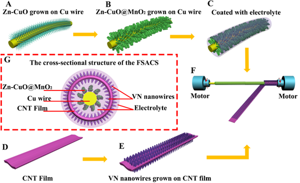 图1.(A-F)同轴非对称超级电容器制备示意图。(G)同轴非对称超级电容器截面示意图