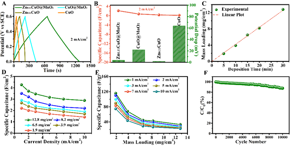 图2.(A-B)CuO,CuO@MnO2,Zn0.11CuO and Zn0.11CuO@MnO2电极电化学充放电曲线及比容量与压降图。(C)MnO2负载量与沉积时间的关系。(D-E)Zn0.11CuO@MnO2电极在不同MnO2负载量时面积和质量比容量的关系。(F)Zn0.11CuO@MnO2电极循环稳定性