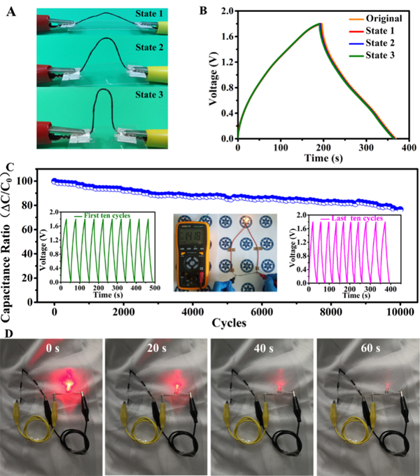 图3.(A)同轴非对称超级电容器在不同弯曲状态下的光学图片。(B)在1-3弯曲状态下,同轴非对称超级电容器的充放电曲线。(C)在90度弯曲状态下,器件的充放电循环测试。(D)同轴非对称超级电容器在便携式可穿戴领域展示出潜在的应用前景