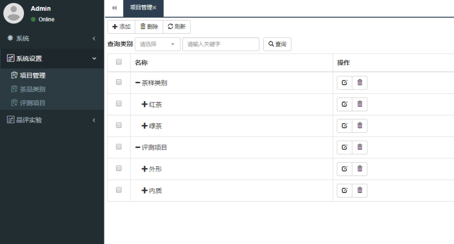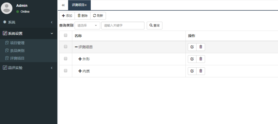 (2) 评测项目管理:例如可对外形和内质进行评测,可根据实际需求挑选项目。