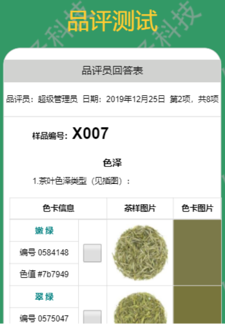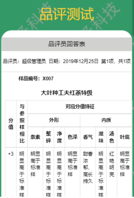 同时,可选择下一级菜单进行测评,例如:条索、整碎、色泽、净度、香气、滋味、汤色、叶底等,可根据实际需求挑选项