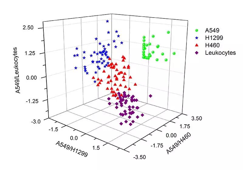 肺癌包含非常多的亚型,并且不同亚型的肺癌在治疗方法上存在很大的区别,因此正确地识别和区分不同的肺癌亚型对于选择合适的治疗方案、降低患者死亡率及延长患者生命非常重要。目前,识别和区分癌细胞的方法主要有两大类:一是根据细胞的物理性质区分如大小、密度等等,但是这种方法难以区分不同的癌细胞;二是根据细胞的生物学特性区分如蛋白的表达等,但是这种方法只能识别有特定生物标记的细胞,并且当几种细胞表面标记相同时,便难以区分。与以上两类方法相比,采用细胞本身(分子组成和结构)不同的表面增强拉曼光谱,无需引入其他标记,便可以区分不同的癌细胞,具有无损和高灵敏度的特点。