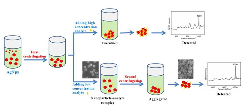 两步离心法的理论依据如下:对于高浓度样本,纳米粒子经过第一次离心浓缩来调节其与待检物分子之间的比例使待检物分子大量吸附于纳米粒子,进而导致纳米粒间距急剧缩小,样本出现絮凝,同时获得很强的表面增强因子,待检物成功被检测。对于低浓度和超低浓度样本,由于待检物分子本身有限,吸附于纳米粒上的分子更加有限,即使经过第一次离心浓缩调节纳米粒子与待检物分子之间的比例,样本也不能絮凝,仅能形成纳米粒子-待检分子复合物。这种情况下,借助于第二次离心浓缩可以极大的缩小上述复合物之间的间距而获得较高的增强因子,从而达到检测目的。