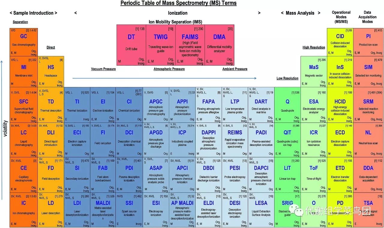 因此AMC就建立了一张关于质谱的“周期表”,为非专业的质谱操作者介绍复杂的质谱术语。IUPAC(International Union of Pure and Applied Chemistry)近期的一篇综述记载了超过500种质谱术语,本周期表只是选取了其中最常用的技术进行解释。