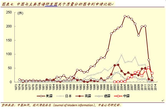国外核心技术的ZL申请在1980s后经历较大的爆发期。1912年J.J.Thomson研制第一台质谱仪用于辨别氖元素及其同位素,100多年内质谱的技术高度与运用领域得到不断提升。早年质谱仪主要用于同位素测定和无机物分析,1940s后开始用于有机物分析;1960s首次出现气相色谱和质谱的联用(GC-MS),质谱成为有机物分析的重要方法。1980s后随着计算机的加入,各类技术的升级,全球质谱得到了极快的发展,并在更广发领域应用。
