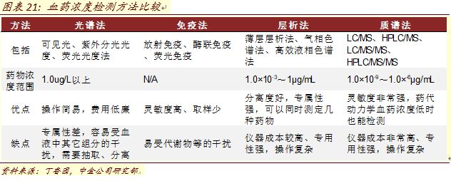 质谱法是精度最高的血药浓度检测方法。血药浓度是TDM的主要参考指标,目前血药浓度检测的主要方法有光谱法、免疫法、色谱法、质谱法等,其中质谱法可理解为是色谱法的升级,即质谱作为分析器处理色谱层析后的样品。相比于传统方法而言,质谱法是更为灵敏与精准的检测方式,同样的对于前期的设备投入与人员的操作要求都比较高。成本因素是其大范围推广的最主要原因。