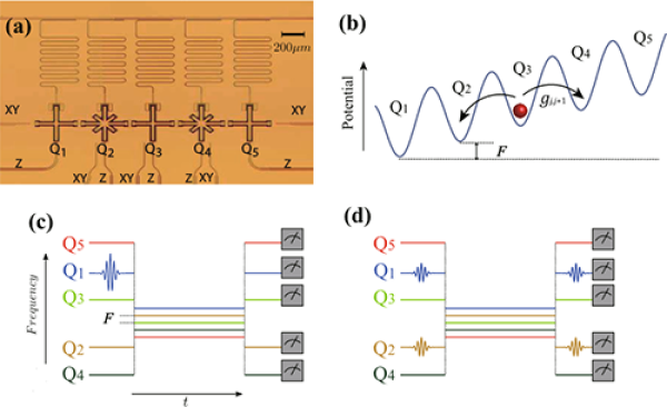 集成有多个量子比特的超导处理器是实现大规模量子计算的重要方案之一,由于其每个量子比特可独立程序化调控,不同量子比特可通过谐振腔产生纠缠,易于实现由单比特和多比特逻辑门构成的量子线路,从而实现通用量子计算。此外,超导量子处理器本身的哈密顿量可以直接对应特定的量子系统,可研究不同物理的量子模拟,利用此平台研究布洛赫震荡和瓦尼尔-斯塔克局域现象具有重要意义。