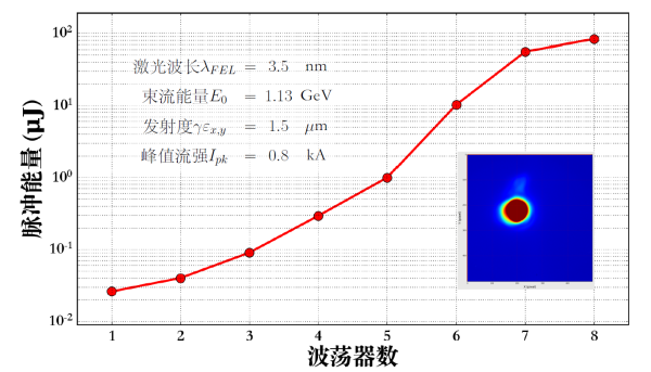 图2.3.5纳米自由电子激光饱和增益曲线、光斑和主要参数