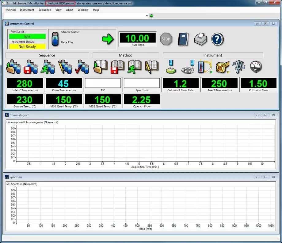 只需一个简单流程即可将安捷伦 GC/MSD 或“单四极杆”中的现成方法加载到安捷伦三重四极杆 GC/MS 或“三重四极杆”上。 安捷伦 MassHunter 工作站数据采集主屏幕(图 1)展示了当前被加载到仪器中的三重四极杆方法示例;在此情况下为 checkout.7000.eiex.m。