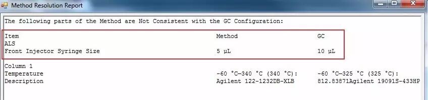 为加载所需方法,请单击方法 > 载入单四极杆 (597x) 方法。方法载入后,方法解析报告将列出新方法与三重四极杆现有配置之间的差异。如图 2 中所示,方法需要一个 5 μL 注射器,而 GC 配置了一个 10 μL 注射器。在方法编辑屏幕,根据需要改变项目使得方法和 GC 配置相匹配。