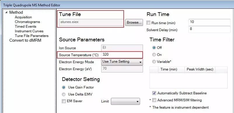 图 4. 改变方法中的离子源温度,并载入所需的三重四极杆调谐文件