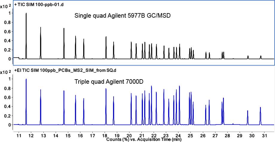 图 5. 不同仪器间保留时间一致:将保留时间锁定至单四极杆 MSD 后使用 Agilent 5977B GC/MSD 和 Agilent 7000D 三重四极杆 GC/MS 对 PCB 进行分析