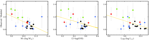 观测的850微米流量与模型预期值之比与恒星质量、氧丰度和总红外光度的关系。其中红色和绿色方块代表存在亚毫米超的星系,蓝色和黑色方块代表不存在亚毫米超的星系