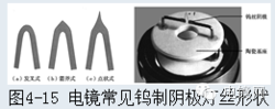 (1)阴极是产生自由电子的源头,一般有直热式和旁热式2种,旁热式阴极是将加热体和阴极分离,各自保持独立。在电镜中通常由加热灯丝(filament)兼做阴极称为直热式阴极,材料多用金属钨丝制成,其特点是成本低,但亮度低,寿命也较短。灯丝的直径约为0.10~0.12mm,当几安培的加热电流流过时,即可开始发射出自由电子,不过灯丝周围必须保持高度真空,否则就象漏气灯泡一样,加热的灯丝会在倾刻间被氧化烧毁。灯丝的形状最常采用的是发叉式,也有采用箭斧式或点状式的(图4-15),后 2种灯丝发光亮度高,光束尖细集中,适用于高分辨率电镜照片的拍摄,但使用寿命更短。
