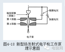 (3)栅极位于阴、阳极之间,靠近灯丝顶端,为形似帽状的金属物,中心亦有一小孔供电子束通过。栅极上加有0~1000V的负电压(对阴极而言),这个负电压称为栅偏压VG,它的高低不同,可由使用者根据需要调整,栅极偏压能使电子束产生向中心轴会聚的作用,同时对灯丝上自由电子的发射量也有一定的调控抑制作用。
