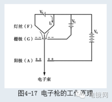 (4)工作原理 图4-17表明,在灯丝电源VF作用下,电流IF流过灯丝阴极,使之发热达2500℃以上时,便可产生自由电子并逸出灯丝表面。加速电压VA 使阳极表面聚集了密集的正电荷,形成了一个强大的正电场,在这个正电场的作用下自由电子便飞出了电子枪外。调整VF可使灯丝工作在欠饱和点,电镜使用过程中可根据对亮度的 需要调节栅偏压VG的大小来控制电子束流量的大小。