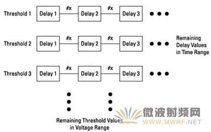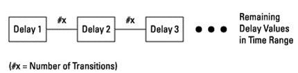 当独有的 OR 输出很高时,延迟的样本会有所差别,并且会在延迟时间之间检测到转变。由于采样信号的不稳定和其他变化,眼定位 测量将对每对延迟值的多个时钟进行检查,以便报告两次延迟时间之间发生转变的频率。然后,检查另一对延迟值,依次类推,直到扫描完转变的整个时间范围。