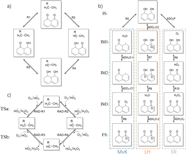 图1.纳米碳催化剂上乙苯氧化脱氢反应网络。a)脱氢反应,b)催化剂活化反应,c)自由基反应